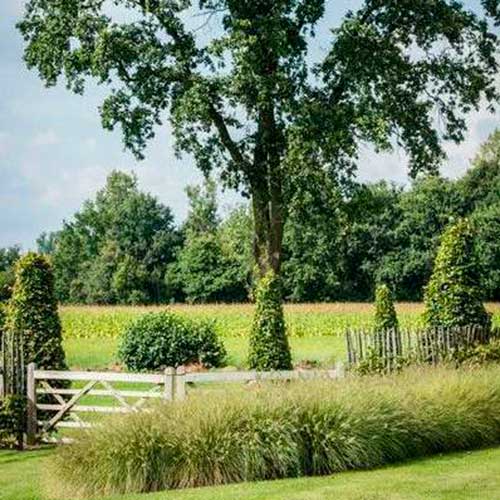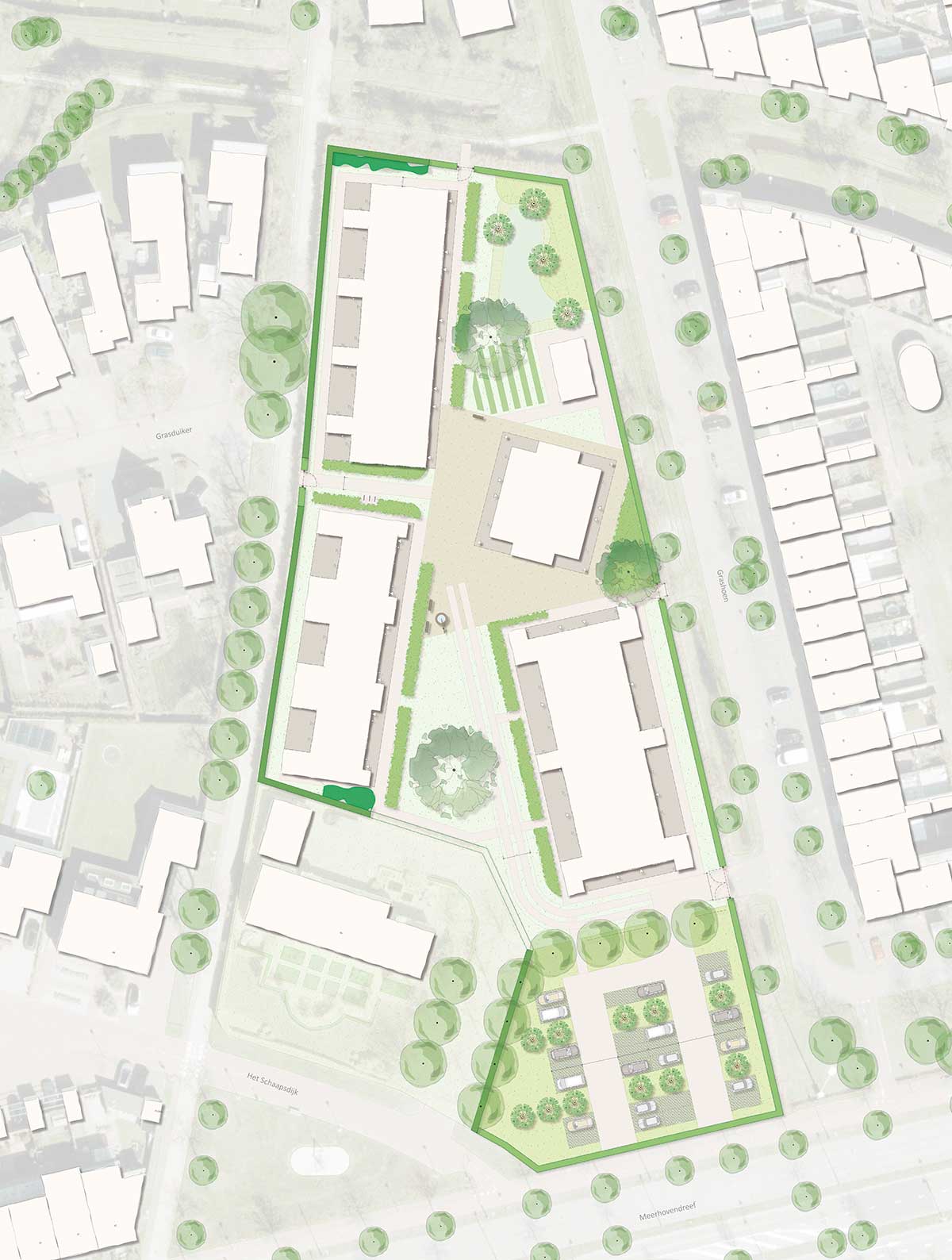 Veel grote bomen en bestaande heggen zijn opgenomen in het landschapsontwerp. Dankzij de volwassen natuur in combinatie met de bescheiden hoogte van de woningen, blijft het groene uitzicht behouden. De groene afscheiding rondom het terrein vormt een belangrijke verbinding tussen de nieuwe woningen en de bestaande wijk. Daarom wordt ook rekening gehouden met voorkeuren van direct omwonenden bij de aanleg hiervan.